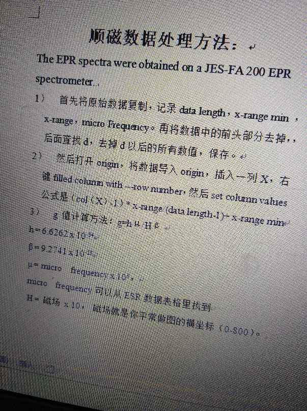 我的ESR数据只有一列,不知道横坐标如何去,图一是文献上的图,也是我想做出来的图,图二是我的数据,图三是做测试的老师发的作图方法,但是我看不懂,不知道横坐标是什么。 发自小木虫Android客户端 |