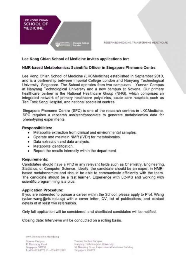 新加坡南洋理工大学诚聘代谢组学方向SCIENTIFIC OFFERS