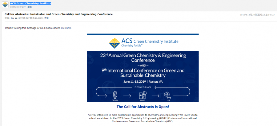 收到ACS Green Chemistry Institute的Call for Abstracts:sustainable and Green chemistry and Engineering Conference 是邀请吗? 还是会议广告 有意义去吗 QQ截图20181122095418.png |