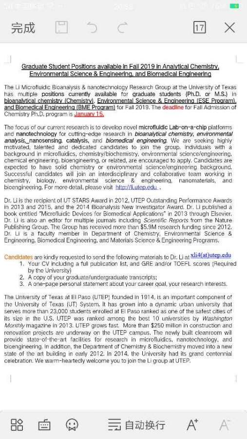 有意向者请直接联系导师Dr. XiuJun (James) Li, xli4@utep.edu,附上个人简历,成绩单,个人陈述。 发自小木虫Android客户端 |