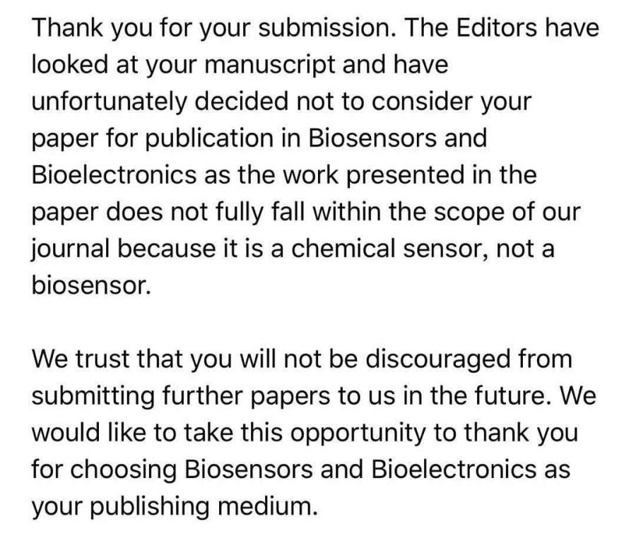 是编辑,说你的文章不符合人家的领域啊,人家是生物传感器类的,你的化学类的 发自小木虫Android客户端 |
