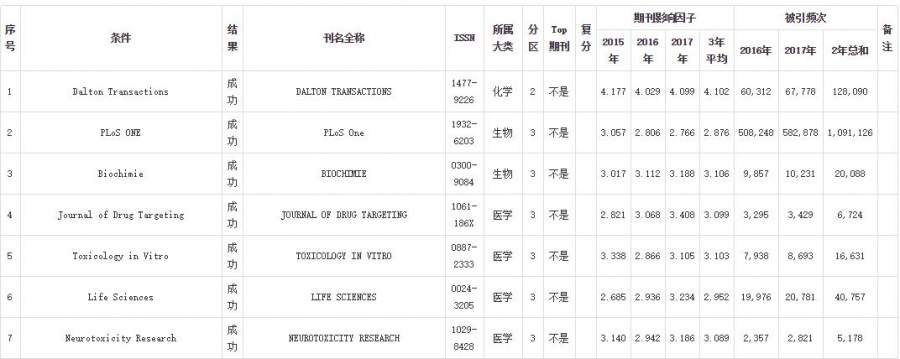 期刊全称: AIP Advances 期刊简称: AIP ADV ISSN: 2158-3226 年份: 2018年 综述: 否 学科名称 分区 Top期刊 小类 MATERIALS SCIENCE, MULTIDISCIPLINARY材料科学:综合 4 - 小类 NANOSCIENCE & NANOTECHNOLOGY纳米科技 4 - 小类 PHYSICS, APPLIED物理:应用 4 - 大类 工程技术 4 否 期刊影响因子 总被引频次 2015年 2016年 2017年 2015-2017年平均 2016年 2017年 2016年-2017年 1.444 1.568 1.653 1.555 4463 6675 11138 期刊全称: SOLID STATE IONICS 期刊简称: SOLID STATE IONICS ISSN: 0167-2738 年份: 2018年 综述: 否 学科名称 分区 Top期刊 小类 CHEMISTRY, PHYSICAL物理化学 4 - 小类 PHYSICS, CONDENSED MATTER物理:凝聚态物理 3 - 大类 物理 2 否 期刊影响因子 总被引频次 2015年 2016年 2017年 2015-2017年平均 2016年 2017年 2016年-2017年 2.380 2.354 2.751 2.495 22402 24246 46648 |