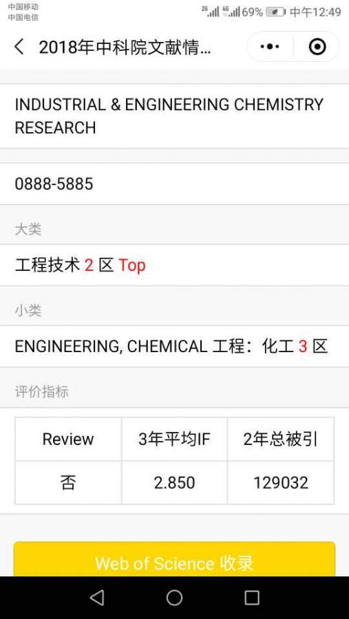 | 哪位大神帮忙查一下:Industrial and Engineering Chemistry Research还是化工TOP期刊吗?微信公众号不显示是否TOP期刊,请给个网页截屏,谢谢! |