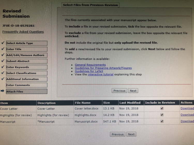 前段时间投了一篇fuel,现已经修改完毕,准备上传文件,但遇到以下问题,想请教各位。 “to include a file your revised submission, tick the box opposite the relevant file ;to exclude a file from your revised submission, leave the box opposite the relevant file unticked ” 我理解的意思是,针对第一次投稿所提交的文件(如manuscript,cover letter),如果这次返回的时候,对之前文件进行了修改,就需要勾选方框。反之,则不勾选。不知我理解是否正确? 另外,fuel提交文件的时候,默认是第一次投稿的文件还存在,是否需要将其移除,只提交修改后的文件和审稿人意见回复。 如果有此投稿经验的虫友,请帮忙解答一下,万分感谢。 发自小木虫IOS客户端 |