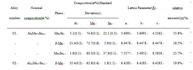 The sum of mass% which is easily available from INKA is still not given in Table 2. This information is important! The given errors are partly unrealistic, e.g. C4, at% of Al in "MnSn2" is given as 0.5(0.1). This error comes may be from statistics of several measurements but does not include systematic errors. The determination of light elements within a matrix of rather heavy elements has for sure an error of more than 0.5 at.%, which is considered to be the minimum error of conventional SEM/EDX method.