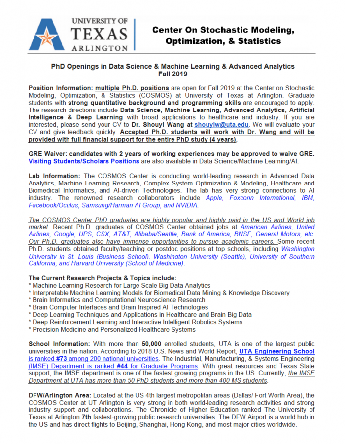 美国德州大学 Data Science/Machine Learning/AI 方向博士招生数名 全奖 19Fall