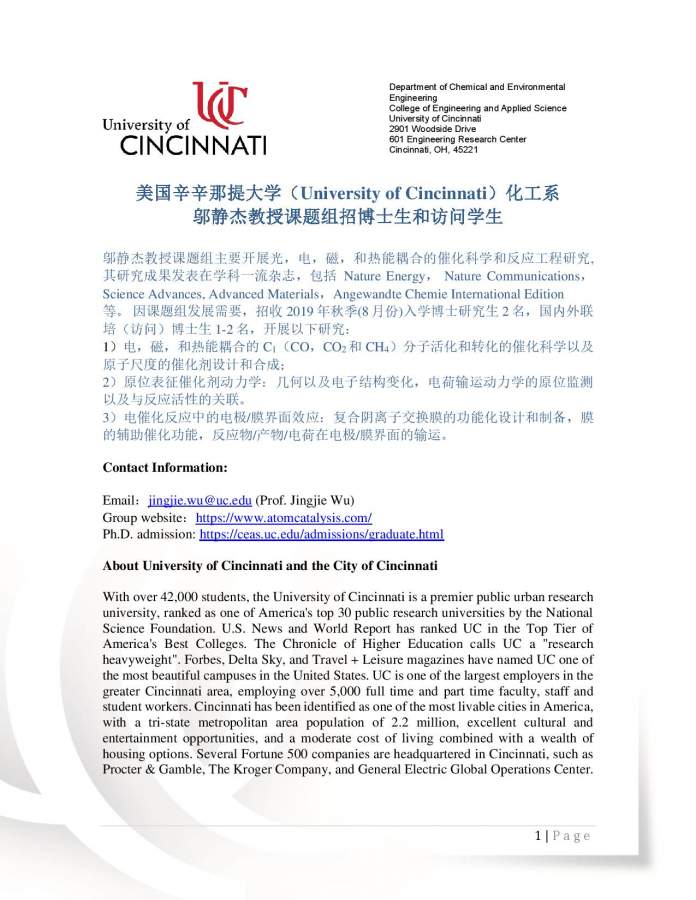 美国辛辛那提大学(University of Cincinnati)化工系 招博士生和访问学生