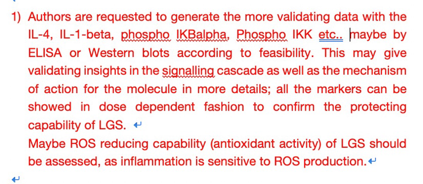楼主的文章主要做的事一个中药复方LGS的抗炎活性及机制研究,以前课题组师姐做这个方发了一篇SCI,主要研究NF-kB,我做这个方研究的是STAT3通路与miRNA ,因此检测了STAT3,IL-6及miRNA的表达,一审意见回来有一个审稿人表示检测指标太少,要求检测IKBa、IKK、IL-4、ROS?我做的是STAT3通路,不是特别理解为什么要测NF-kB通路的炎症指标?想听听大家的意见,需要补实验嘛?还是选择性补一部分?或者保险起见全补然后一部分放于support information 发自小木虫IOS客户端 |