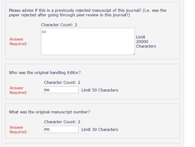 爱思唯尔旗下cej被秒拒了后,没有做任何题目内容上的修改,转投jhm,然后投稿系统里出现了如下信息。 是否时系统检测到这个账号近期被拒文章,然后才问如下问题?不然怎么会问原始审稿人和文章号 还是这些问题本身就有,如果是第一次投这个杂志全填no就行了? 按理说问的是 是否被本杂志拒绝过,应该不是包括所有爱思唯尔旗下杂志把? 微信图片_20190304141950.png |