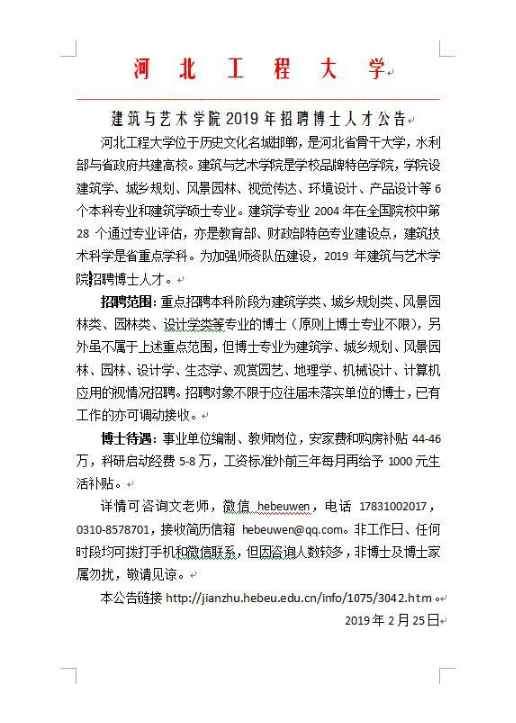 重点招聘本科阶段是建筑学城乡规划风景园林设计学的博士,其他专业博士视情况招聘。联系微信hebeuwen 发自小木虫Android客户端 |