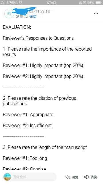 一审14天两个审稿人都给了highly important(top 20%),编辑让修改,修改十天后返回稿件,目前二审已经快两个星期了,还没有消息,每天都很担心,很忐忑。都说二审时间越长,情况越不妙,真心希望自己有好运,能有好消息! @Monash2011 发自小木虫Android客户端 |
