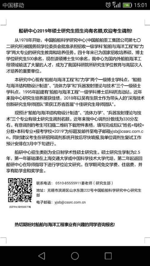 中国船舶科学研究中心招收调剂考生,欢迎力学,船舶,机械,计算机专业考生报考。联系请备注小木虫推荐。 发自小木虫Android客户端 |