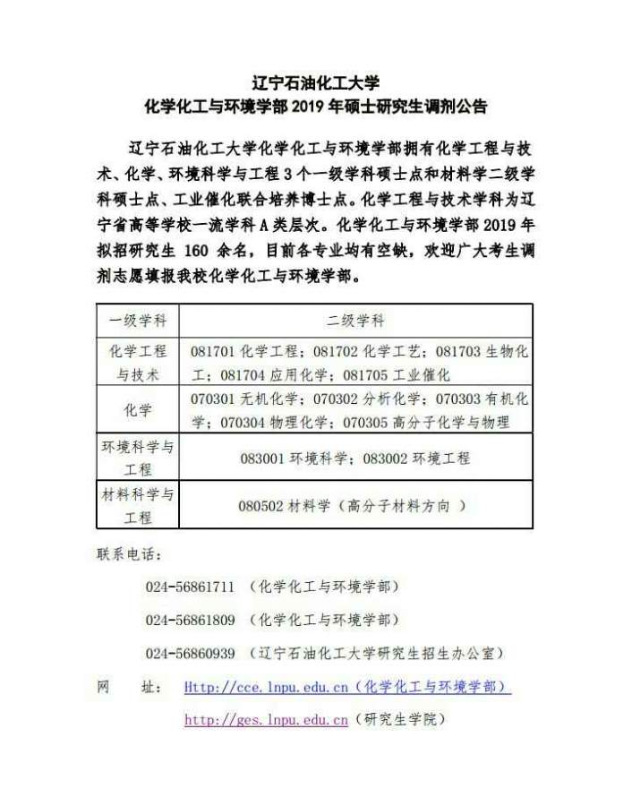 ÁÉÄþʯÓÍ»¯¹¤´óѧ»¯Ñ§»¯¹¤Óë»·¾³Ñ§²¿2019ÄêÑо¿Éúµ÷¼ÁÕÐÉú¹«¸æ