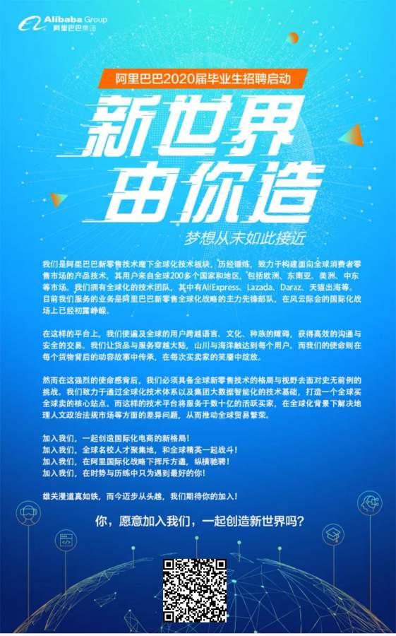 我们是阿里巴巴新零售技术麾下全球化技术板块,历经锤炼,致力于构建面向全球消费 者零售市场的产品技术,其用户来自全球200多个国家和地区,包括欧洲、东南亚、美洲 、中东等市场。我们拥有全球化的技术团队,其中有AliExpress、Lazada、 Daraz、天猫出海等。目前我们服务的业务是阿里巴巴新零售全球化战略的主力先锋部队 ,在风云际会的国际化战场上已经初露峥嵘。 在这样的平台上,我们使遍及全球的用户跨越语言、文化、种族的障碍,获得高效的沟 通与安全的交易。我们让货品与服务穿越大陆,山川与海洋触达到每个用户。而我们的 使命则在每个货物背后的动容故事中传承,在每次买卖家的笑靥中绽放。 然而在这强烈的使命感背后,我们必须具备全球新零售技术的格局与视野去面对史无前 例的挑战。我们致力于通过全球化技术体系以及集团大数据智能化的技术基础,打造一 个全球买全球卖的核心站点。而这样的技术平台将服务于数十亿的活跃买家,在全球化 背景下解决地理人文政治法规市场等方面的差异问题,从而推动全球贸易繁荣。 加入我们,一起创造国际化电商的新格局! 加入我们,全球名校人才聚集地,和全球精英一起战斗! 加入我们,在阿里国际化战略下挥斥方遒,纵横驰骋! 加入我们,在时势与历练中只为遇到最好的你! 雄关漫道真如铁,而今迈步从头越,我们期待你的加入! 本次招聘主要面向2019年11月后毕业的2020届毕业生,具体信息可加入微信群(见下面 二维码)或直接扫描校招海报二维码申请,或者直接发邮件给shujun.ljs@alibaba-inc. com咨询岗位等招聘信息或提交简历。 微信群二维码.jpg 校招海报.jpg [ 来自版块群 浙江 ] |