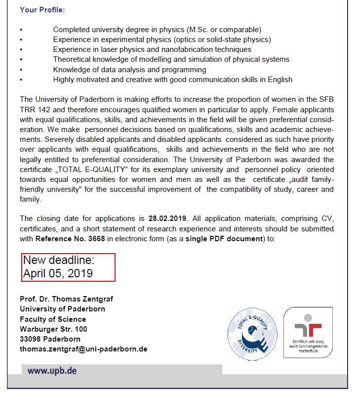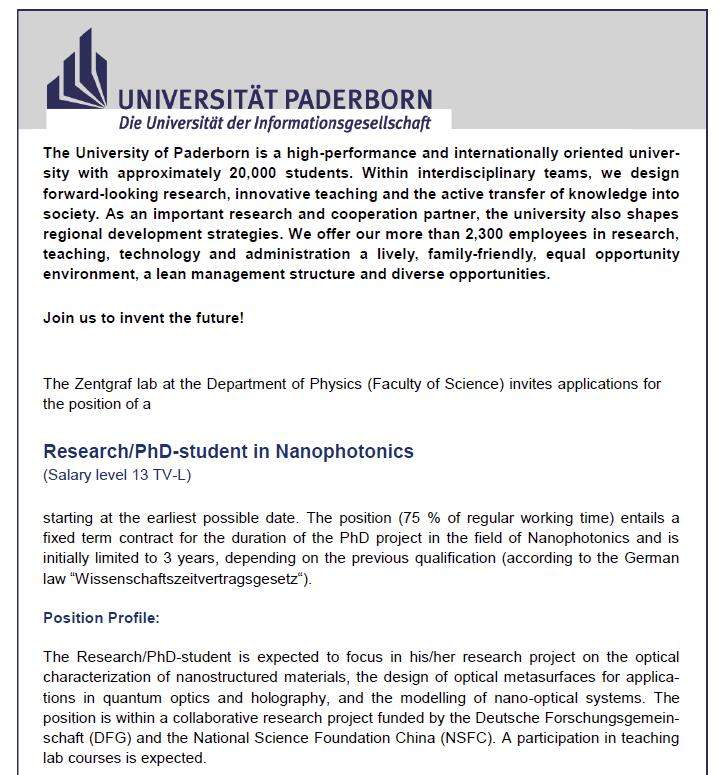 德国 帕德伯恩大学Thomas Zentgraf教授招收博士研究生 专业:物理,光学,纳米,光电子等相关专业 课题组主页:https://physik.uni-paderborn.de/en/zentgraf/ Prof.Thomas_1.jpg Prof.Thomas_2.jpg |