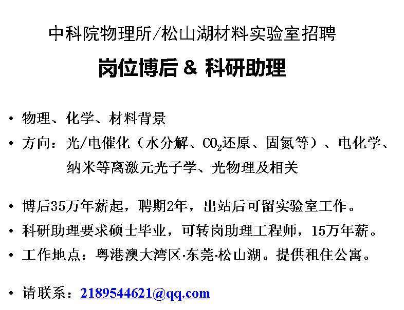 中科院物理所/松山湖材料实验室招聘 岗位博后 & 科研助理 •物理、化学、材料背景 •方向:光/电催化(水分解、CO₂还原、固氮等)、电化学、 纳米等离激元光子学、光物理及相关。 •博后35万年薪起,聘期2年,出站后可留实验室工作。 •科研助理要求硕士毕业,可转岗助理工程师,15万年薪。 •工作地点:粤港澳大湾区•东莞•松山湖。提供租住公寓。 •请联系:2189544621@qq.com 招聘.jpg [ 来自版块群 广东 ] |