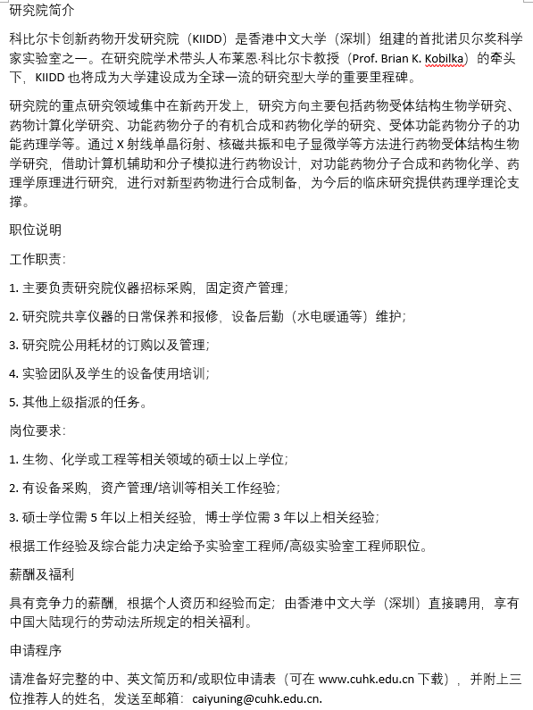 科比尔卡创新药物开发研究院(KIIDD)是香港中文大学(深圳)组建的首批诺贝尔奖科学家实验室之一。在研究院学术带头人布莱恩·科比尔卡教授(Prof. Brian K. Kobilka)的牵头下,KIIDD也将成为大学建设成为全球一流的研究型大学的重要里程碑。 研究院的重点研究领域集中在新药开发上,研究方向主要包括药物受体结构生物学研究、药物计算化学研究、功能药物分子的有机合成和药物化学的研究、受体功能药物分子的功能药理学等。通过X射线单晶衍射、核磁共振和电子显微学等方法进行药物受体结构生物学研究,借助计算机辅助和分子模拟进行药物设计,对功能药物分子合成和药物化学、药理学原理进行研究,进行对新型药物进行合成制备,为今后的临床研究提供药理学理论支撑。 职位说明 工作职责: 1. 主要负责研究院仪器招标采购,固定资产管理; 2. 研究院共享仪器的日常保养和报修,设备后勤(水电暖通等)维护; 3. 研究院公用耗材的订购以及管理; 4. 实验团队及学生的设备使用培训; 5. 其他上级指派的任务。 岗位要求: 1. 生物、化学或工程等相关领域的硕士以上学位; 2. 有设备采购,资产管理/培训等相关工作经验; 3. 硕士学位需5年以上相关经验,博士学位需3年以上相关经验; 根据工作经验及综合能力决定给予实验室工程师/高级实验室工程师职位。 薪酬及福利 具有竞争力的薪酬,根据个人资历和经验而定;由香港中文大学(深圳)直接聘用,享有中国大陆现行的劳动法所规定的相关福利。 申请程序 请准备好完整的中、英文简历和/或职位申请表(可在www.cuhk.edu.cn下载),并附上三位推荐人的姓名,发送至邮箱:caiyuning@cuhk.edu.cn. 【本广告长期有效,招满即止】 招聘广告-实验室经理.png 研究院简介.png [ 来自版块群 广东 ] |