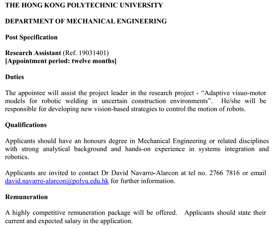 香港理工大学-机械工程学院-机器人方向 诚聘RA一名(不需要语言成绩)可转mphil/phd
