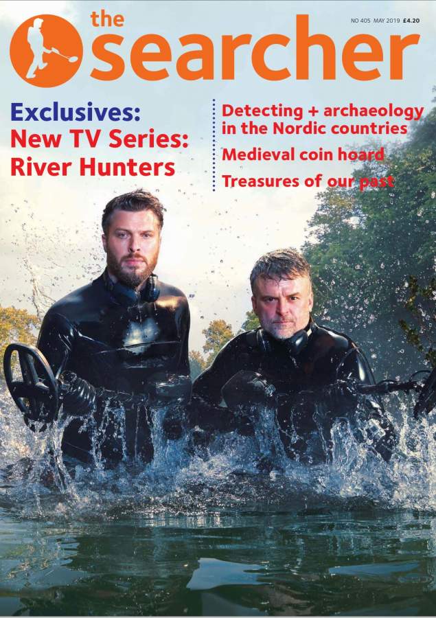 On the cover of our BIG Christmas issue we have an EXCLUSIVE mind blowing Bronze Age bulla, the workmanship is out of this world. ‘12,000 object and counting’ by Gary Bankhead who writes on the finds he’s recovered from the River Wear! There is a fantastic 18th century apothecary bottle from the Thames foreshore, and a Special Conservation report on an Anglo Saxon burial assemblage. We also have a great story on repatriating a US Dog Tag, a report on Detectorworld and Part 2 on the Nokta I Makro Anfibio Multi which covers Preferred Settings, hints and tips by Sid Perry and Daniel Spencer. It’s a packed issue which a lot more within the pages!![The Searcher - May 2019]()