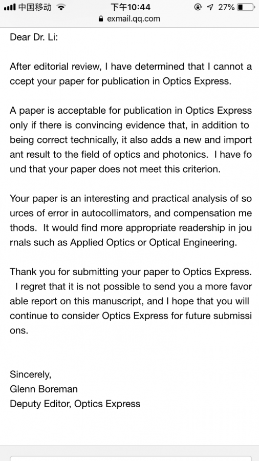 OSA的期刊通常是被一家拒了就不能投其他家的了,既然让你转投AO那就说明还是看好你的,AO是OSA旗下最老牌的期刊,虽然是三区,但是口碑不错,果断转投AO啊,记得cover letter里附上OE编辑让转投这个内容 发自小木虫Android客户端 |