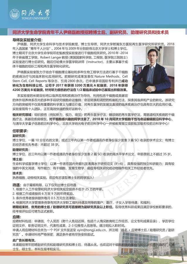 尹晓磊教授实验室致力于结合干细胞理论基础和多种生物工程学方法进行基于干细胞 的疾病治疗与其临床转化应用研究。 前期研究成果发表在nature methods,cell stem cell, cell reports 等杂志,引用2800 余次。 在美期间已申请多项国际专利,并于美国成功转化为生物科技公司。公司于2017 年获得3200 万美元a 轮融资,2018 年获得 4200 万美元b 轮融资。针对听力损伤的疗法在1/2 期临床试验中已展现出积极效果。 待遇:由于篇幅有限,以下仅列出博士后待遇: 1. 根据个人工作背景和同济大学相关规定提供不低于25万的年薪。 2. 根据工作成绩提供6万至9万的年终奖励。 3. 条件优秀者提供额外每月0.5万元生活津贴; 4. 根据同济大学管理条例享有同济大学职工福利待遇及同等的落户、医疗、子女入学等福利; 聘期结束时,优秀的博士后/助理研究员可直接聘为副研究员及以上职位。取得优秀科研成果且满足学校教职要求的,经考核评估后可聘为正式教职。 尹晓磊实验室招聘-150.jpg [ 来自版块群 上海 ] |