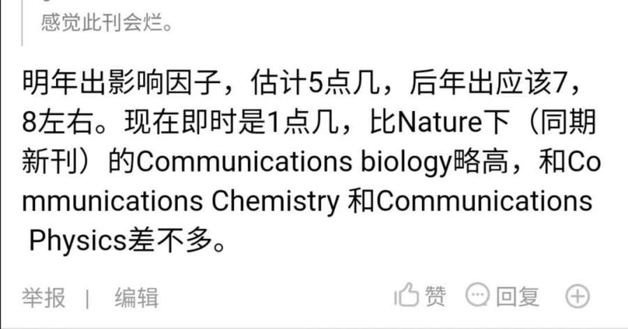 明年出影响因子,估计5点几,后年出应该7,8左右。现在即时是1点几,比Nature下(同期新刊)的Communications biology略高,和Communications Chemistry 和Communications Physics差不多。 发自小木虫Android客户端 |