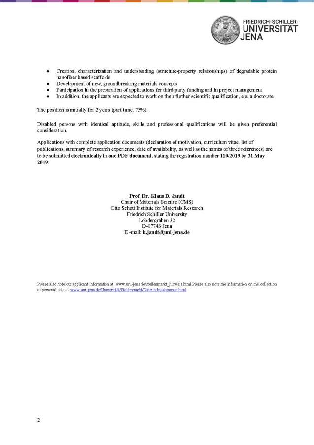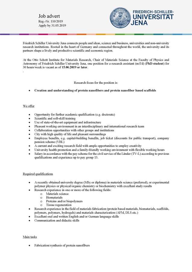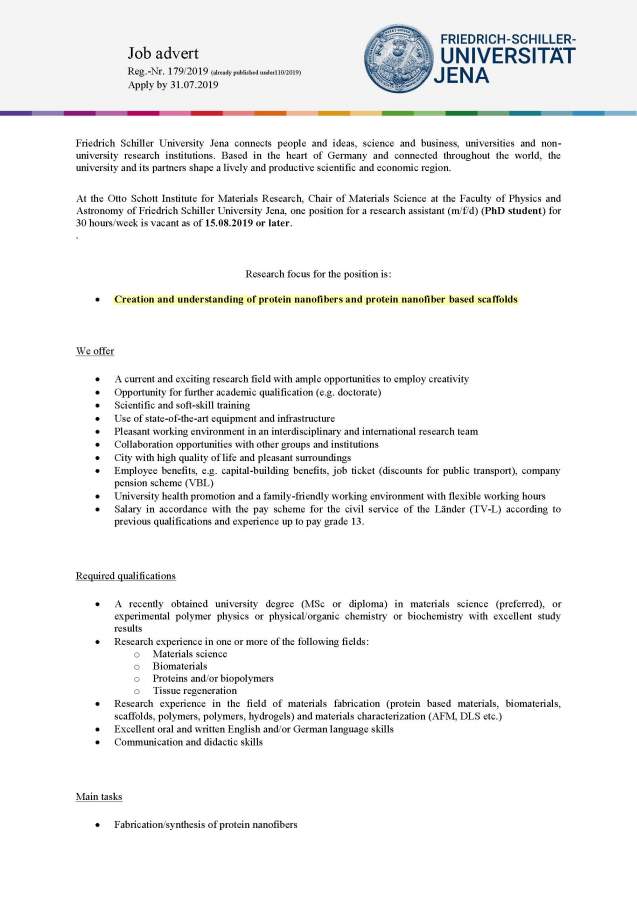 德国耶拿大学otto schott institute for materials research 研究所prof. dr. klaus d. jandt组招聘 “助理研究员(research assistant)” (要求新近硕士毕业; 可申请组里读博士; 工作时间30小时/周)。 研究方向为: 蛋白纳米纤维及其支架制备 (creation and understanding of protein nanofibers and protein nanofiber based scaffolds)。prof. jandt领导的chair of materials science课题组拥有较完善材料制备和表征条件,包括先进afm、fibsem、xps、细胞培养等,课题组网址: https://www.cms.uni-jena.de/index.php/staff.html。有意者请于2019年5月31日前发简历 (1个pdf文件;注明职位编号“registration number 110/2019”)至k.jandt@uni-jena.de。具体见如下招聘广告: friedrich schiller university jena connects people and ideas, science and business, universities and non-university research institutions. rooted in the heart of germany and connected throughout the world, the university and its partners shape a lively and productive scientific and economic region. at the otto schott institute for materials research, chair of materials science at the faculty of physics and astronomy of friedrich schiller university jena, one position for a research assistant (m/f/d) (phd student) for 30 hours/week is vacant as of 15.06.2019 or later. research focus for the position is: creation and understanding of protein nanofibers and protein nanofiber based scaffolds. we offer: 1. opportunity for further academic qualification (e.g. doctorate); 2. scientific and soft-skill training; 3. use of state-of-the-art equipment and infrastructure; 4. pleasant working environment in an interdisciplinary and international research team; 5. collaboration opportunities with other groups and institutions; 6. city with high quality of life and pleasant surroundings; 7. employee benefits, e.g. capital-building benefits, job ticket (discounts for public transport), company pension scheme (vbl); 8. a current and exciting research field with ample opportunities to employ creativity; 9. university health promotion and a family-friendly working environment with flexible working hours salary in accordance with the pay scheme for the civil service of the länder (tv-l) according to previous qualifications and experience up to pay group 13. required qualifications: 1. a recently obtained university degree (msc or diploma) in materials science (preferred), or experimental polymer physics or physical/organic chemistry or biochemistry with excellent study results. 2. research experience in one or more of the following fields: materials science, biomaterials, proteins and/or biopolymers, tissue regeneration. 3. research experience in the field of materials fabrication (protein based materials, biomaterials, scaffolds,polymers, polymers, hydrogels) and materials characterization (afm, dls etc.). 4. excellent oral and written english and/or german language skills communication and didactic skil.ls main tasks: 1. fabrication/synthesis of protein nanofibers; 2. creation, characterization and understanding (structure-property relationships) of degradable protein nanofiber based scaffolds; 3. development of new, groundbreaking materials concepts; participation in the preparation of applications for third-party funding and in project management; 4. in addition, the applicants are expected to work on their further scientific qualification, e.g. a doctorate. the position is initially for 2 years (part time, 75%). disabled persons with identical aptitude, skills and professional qualifications will be given preferential consideration. applications with complete application documents (declaration of motivation, curriculum vitae, list of publications, summary of research experience, date of availability, as well as the names of three references) are to be submitted electronically in one pdf document, stating the registration number 110/2019 by 31 may 2019: prof. dr. klaus d. jandt chair of materials science (cms) otto schott institute for materials research friedrich schiller university löbdergraben 32 d-07743 jena e -mail: k.jandt@uni-jena.de job advert apply by 31.05.2019-1.jpg job advert apply by 31.05.2019-2.jpg 德国耶拿大学Otto Schott Institute for Materials Research 研究所Prof. Dr. Klaus D. Jandt组招聘 “助理研究员(research assistant)/博士生” (新近硕士毕业; 可申请组里读博士; 工作时间30小时/周)。 研究方向为: 蛋白纳米纤维及其支架制备 (Creation and understanding of protein nanofibers and protein nanofiber based scaffolds)。 Prof. Jandt领导的Chair of Materials Science课题组拥有较完善材料制备和表征条件,包括先进AFM、FIBSEM、XPS、细胞培养等,课题组网址: https://www.cms.uni-jena.de/index.php/staff.html。 有意者请于2019年7月31日前发简历 (1个PDF文件;注明职位编号“registration number 179/2019”)至k.jandt@uni-jena.de。 说明(非官方): 简历请用英文;突出教育经历(专业/课题组);突出招聘广告所述方向相关研究经验;突出论文;突出语言能力(英语/德语,或国际交流经历) 具体见如下招聘广告: friedrich schiller university jena connects people and ideas, science and business, universities and non-university research institutions. rooted in the heart of germany and connected throughout the world, the university and its partners shape a lively and productive scientific and economic region. at the otto schott institute for materials research, chair of materials science at the faculty of physics and astronomy of friedrich schiller university jena, one position for a research assistant (m/f/d) (phd student) for 30 hours/week is vacant as of 15.06.2019 or later. research focus for the position is: creation and understanding of protein nanofibers and protein nanofiber based scaffolds. we offer: 1. opportunity for further academic qualification (e.g. doctorate); 2. scientific and soft-skill training; 3. use of s