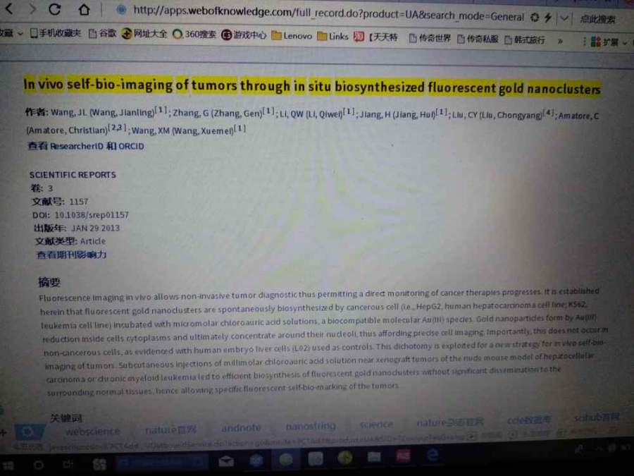 Wang JL, Zhang G, Li QW, Jiang H, Liu CY, Amatore C, et al., In vivo self-bio-imaging of tumors through in situ biosynthesized fluorescent gold nanoclusters. Sci. Rep., 2013, 3: 1157 参见引文4: https://link.springer.com/article/10.1186%2Fs12951-015-0071-y |