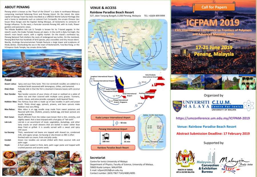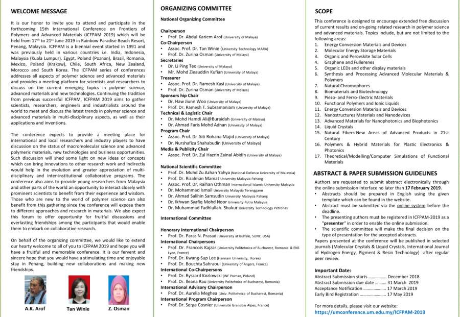 welcome message it is our honor to invite you to attend and participate in the forthcoming 15th international conference on frontiers of polymers and advanced materials (icfpam 2019) which will be held from 17th to 21st june 2019 in rainbow paradise beach resort, penang, malaysia. icfpam is a biennial event started in 1991 and was previously held in various countries i.e. india, indonesia, malaysia (kuala lumpur), egypt, poland (poznan), brazil, romania, mexico, poland (krakow), chile, south africa, new zealand, morocco and south korea. the icfpam series of conferences addresses all aspects of polymer science and advanced materials and provides a meeting platform for scientists and researchers to discuss on the current emerging topics in polymer science, advanced materials and new technologies. continuing the tradition from previous successful icfpam, icfpam 2019 aims to gather scientists, researchers, engineers and industrialists around the world to meet and discuss the latest trends in polymer science and advanced materials in multi-disciplinary aspects, as well as their applications and inventions. the conference expects to provide a meeting place for international and local researchers and industry players to have discussion on the status of macromolecular science and advanced polymeric materials, new technologies and business opportunities. such discussion will shed some light on new ideas or concepts which can bring innovations to other research work and indirectly would help in the evolution and greater appreciation of multidisciplinary and inter-institutional collaborative programs. the conference also aims to provide young researchers from malaysia and other parts of the world an opportunity to interact closely with prominent scientists to benefit from their experience and wisdom. those who are new to the world of polymer science can also benefit from this gathering since the conference will expose them to different approaches and research in materials. we also expect this forum to offer opportunity for fruitful discussions and everlasting friendships among the participants that would enable them to embark on collaborative research. on behalf of the organizing committee, we would like to extend our hearty welcome to all of you to icfpam 2019 and hope you will have a fruitful and memorable conference. it is our fervent and sincere hope that you would have a stimulating time and enjoyable stay in penang, building new collaborations and making new friendships. 会议网址:https://umconference.um.edu.my/ICFPAM-2019 也可私信 未标题-2.jpg 未标题-3.jpg |