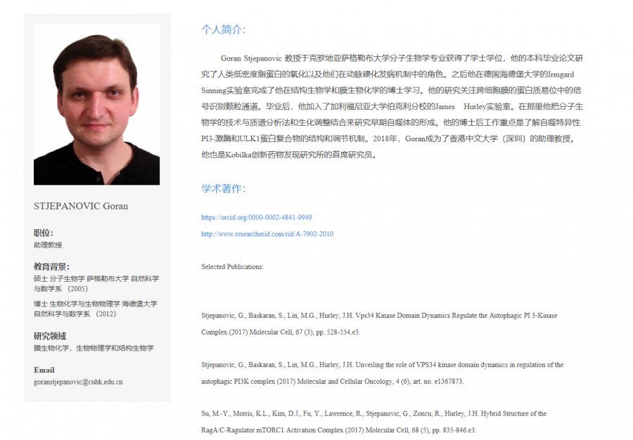 PI ¼ò½é Goran Stjepanovic, ĿǰÈÎÖ°Ïã¸ÛÖÐÎÄ´óѧÉîÛÚÉúÃüÓ뽡¿µÑ§Ôºtenure-trackÖúÀí½ÌÊÚÒÔ¼°¿Æ±È¶û¿¨´´ÐÂÒ©Î↑·¢Ñо¿ÔºÑо¿Ô±¡£2012Äê»ñµÃµÂ¹úº£µÂ±¤´óѧÉúÎﻯѧºÍ·Ö×ÓÎïÀíѧµÄ²©Ê¿Ñ§Î»£¬Ö®ºó·Ö±ðÔÚÃÀ¹úNIH£¬UC Berkeley ºÍÃÀ¹úÀÍÂ×˹²®¿ËÀû¹ú¼ÒʵÑéÊÒ´Óʲ©Ê¿ºóÑо¿¡£ÊµÑéÊÒÑо¿·½ÏòÊÇÀûÓýṹÉúÎïѧ£¨X-ray ºÍCryoEM£©£¬ÖÊÆ×·¨ºÍÉúÎﻯѧÀ´Ñо¿Ä¤ÉúÎﻯѧ£¬°üÀ¨Ï¸°û×ÔÊÉÒÔ¼°Ö¬ÖʵεÈͨ·µÄ·Ö×Óµ÷¿Ø»úÖÆ¡£ÊµÑéÊÒÍøÒ³https://www.stjepanoviclab.org |