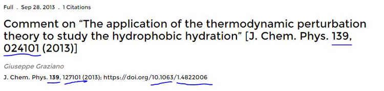 顺序依次为:期刊名,卷(期),页码(或者是article number):doi地址(全文地址) 139为卷(期),127101为你这篇文章的起始页码,10.1063/1.4822006为这篇文章的doi号 024101 是这篇文章“The application of the thermodynamic perturbation theory to study the hydrophobic hydration”的页码或者article number,139是对应卷(期) |