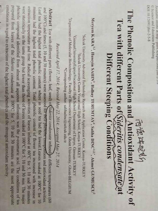 一种植物的名称 原句翻译 The Phenolic Composition and Antioxidant Activity of Tea with different Parts of Sideritis condensate at Different Steeping Conditions 发自小木虫Android客户端 |