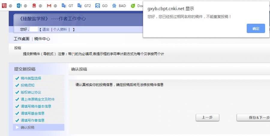最近在硅酸盐学报上投了一篇文章,由于稿件信息有误,编辑发邮件让填对后重投。 我将信息改正后点击投送,弹出提示【您已经投过相同名称的稿件,不能重复投稿】。 此时,我信息有误的稿件有稿件编号,状态为【编辑部处理完毕[退稿]】;信息无误的稿件状态为【未投稿】。 请问,如何才能将信息无误的稿件成功投稿?谢谢大家! 1.jpg |