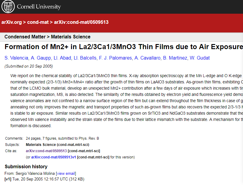 写论文找到了这篇文章,想引用来着,可是这个好像不是发在某个杂志上的,又写着submitted to Phys. Rev. B,不知道该怎么引用? 文章题目是Formation of Mn2+ in La2/3Ca1/3MnO3 Thin Films due to Air Exposure 链接是:https://arxiv.org/abs/cond-mat/0509513 网页截图是这样的 1558264627(1).png |
