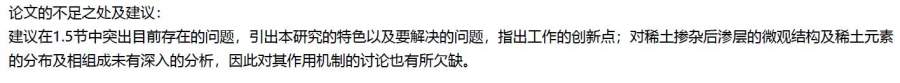前几天盲审意见回来了,其中一个意见感觉有点模棱两可,我已按照要求将1.5的修改了,但后面他提到微观结构和相组成未深入分析,作用机制讨论欠缺,我之前写论文时查了很多文献,在这方面都没有分析,这个地方感觉就是有点无法解释,现在论文里面写的已经是我能分析的极限了,面对这种情况该怎么办?这个老师给的总评是优秀,同意答辩,如果我没有修改,答辩时老师问起该怎么回答呢 盲审意见.jpg |