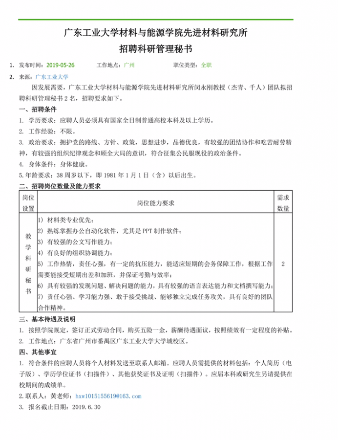 科研管理秘书-广东工业大学材料与能源学院先进材料研究所闵永刚教授团队