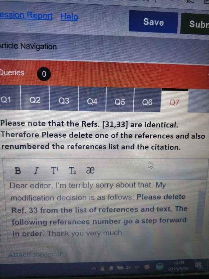 1.由于网页反应慢,自己点错了,有个空格弄成下标+斜体,并且无法撤销,应该怎么操作。 2.编辑提出文献31和文献33一模一样需要删掉一个,我应该直接在proof里面改呢,还是告诉编辑怎么去改(像图里面那样的回答)。 发自小木虫Android客户端 |