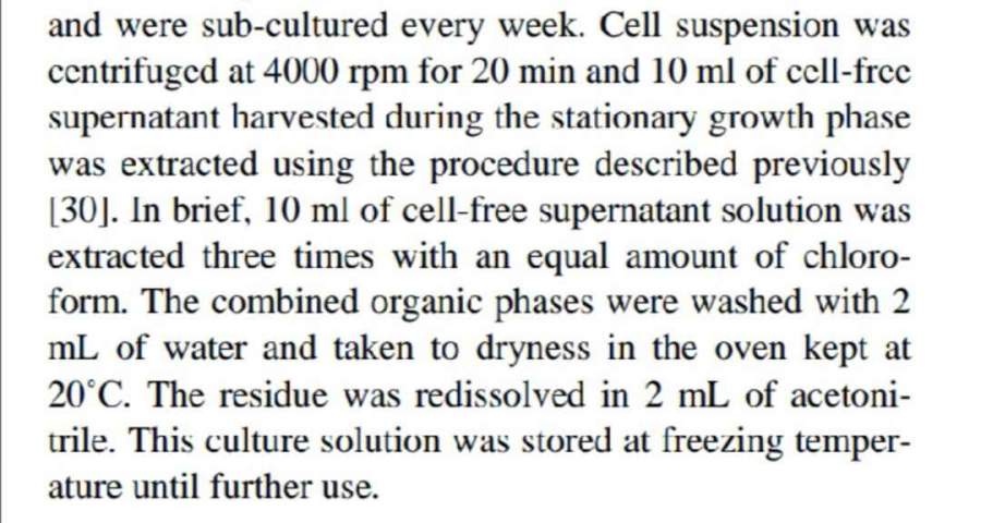 Cell suspension was centrifuged at 4000rpm for 20 min and 10 ml of cell-free supernatant harvested during the stationary growth phase was extracted using the procesdure described previously [30] 细胞悬液以4000rpm离心20 min,然后利用前面描述的工艺提取静止生长阶段收获的10 ml无细胞上清液[30]。 In brief, 10 ml of cell-free supernatant solution was extracted three times with an equal amount of chloroform. 简而言之,取10ml无细胞上清液,用等量氯仿三次萃取。 The combined orgainc phases were washed with 2 mL of water and taken to dryness in the oven kept at 20. 将混合后的有机相用2毫升水冲洗干净,放入烤箱干燥,温度保持在20℃。 The residue was redissolved in 2 mL of acetonitrile. 残渣在2毫升乙腈中重新溶解。 This culture solution was stored at freezing temperature until further use. 该培养液冷冻保存,待进一步使用。 |