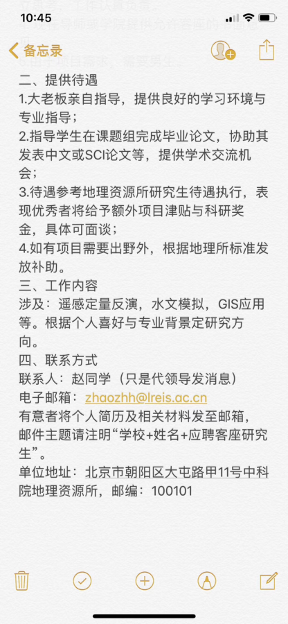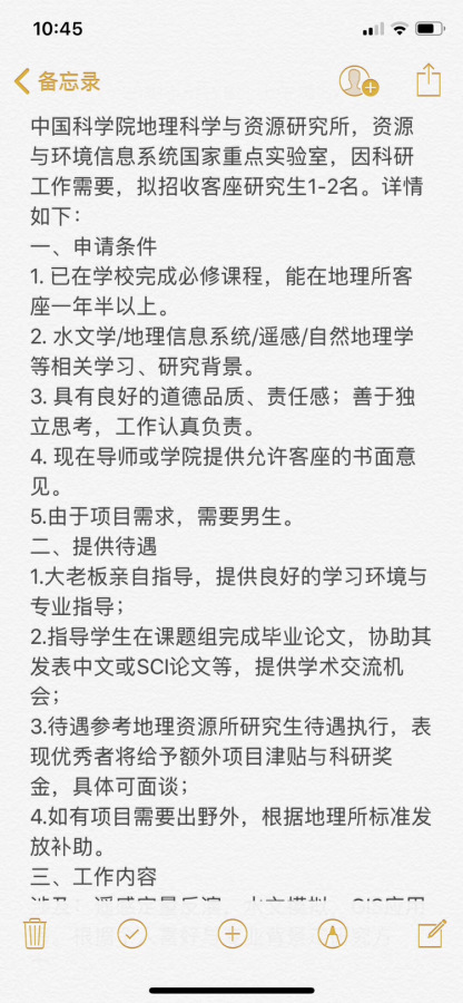 中国科学院地理科学与资源研究所,资源与环境信息系统国家重点实验室,因科研工作需要,拟招收客座研究生1-2名。详情如下: 一、申请条件 1. 已在学校完成必修课程,能在地理所客座一年半以上。 2. 水文学/地理信息系统/遥感/自然地理学等相关学习、研究背景。 3. 具有良好的道德品质、责任感;善于独立思考,工作认真负责。 4. 现在导师或学院提供允许客座的书面意见。 5.由于项目需求,需要男生。 二、提供待遇 1.大老板亲自指导,提供良好的学习环境与专业指导; 2.指导学生在课题组完成毕业论文,协助其发表中文或SCI论文等,提供学术交流机会; 3.待遇参考地理资源所研究生待遇执行,表现优秀者将给予额外项目津贴与科研奖金,具体可面谈; 4.如有项目需要出野外,根据地理所标准发放补助。 三、工作内容 涉及:遥感定量反演,水文模拟,GIS应用等。根据个人喜好与专业背景定研究方向。 四、联系方式 联系人:赵同学(只是代领导发消息) 电子邮箱:zhaozhh@lreis.ac.cn 有意者将个人简历及相关材料发至邮箱,邮件主题请注明“学校+姓名+应聘客座研究生”。 单位地址:北京市朝阳区大屯路甲11号中科院地理资源所,邮编:100101 发自小木虫IOS客户端 |