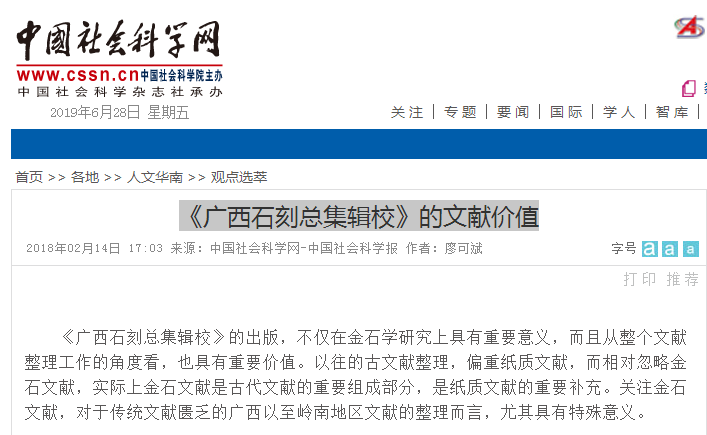 https://www.gongshe99.com/history/478457.html 2018.10.23 2018年度国家社科基金重大项目立项名单公示 https://ex.cssn.cn/gd/gd_rwhn/gd ... 80214_3851934.shtml 2019.02.14 专家谈《广西石刻总集辑校》的文献价值 https://www.cssn.cn/zx/bwyc/201904/t20190407_4860722.shtml 2019.04.06 广西师大杜海军教授国家社科基金重大项目开题 https://www.npopss-cn.gov.cn/n1/2019/0611/c351660-31129878.html 2019.06.11 关于撤销“西南边疆历史与现状综合研究项目”子课题“广西石刻总集整理”的通报 |