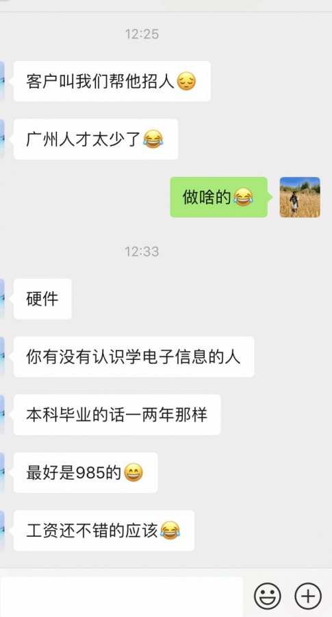 最好是本科985及以上,有至少两年工作经验,地点广州,朋友说薪资15k左右,因工作比较特殊,无法公布招聘单位,如感兴趣的朋友可以先联系我,我把我朋友推荐给你,我不是骗子,聊天记录截图可以发出来,你们自己约谈,各位朋友都是成年人哈,你们可以接触了自己判定真假。岗位职责描述大致如图。版主留情,具体细节需要他们自己去商讨。 发自小木虫IOS客户端 |