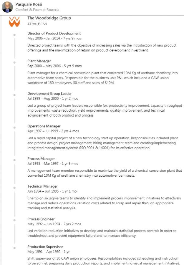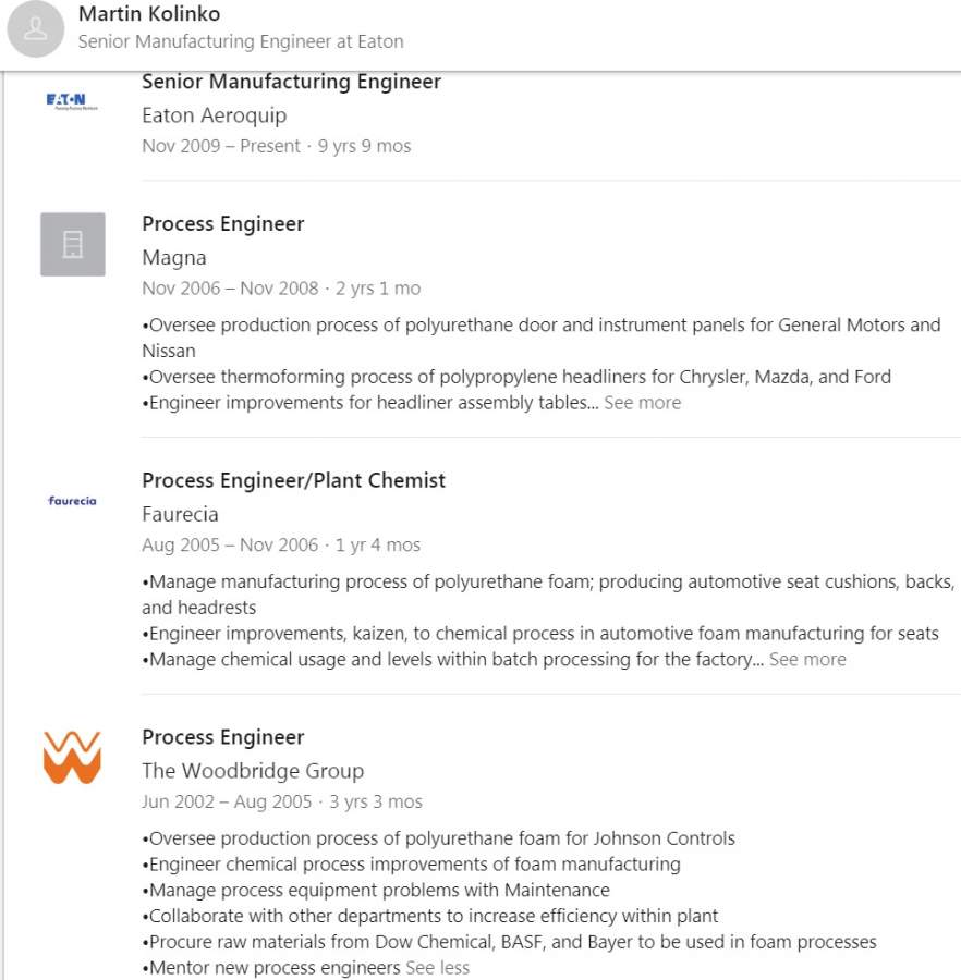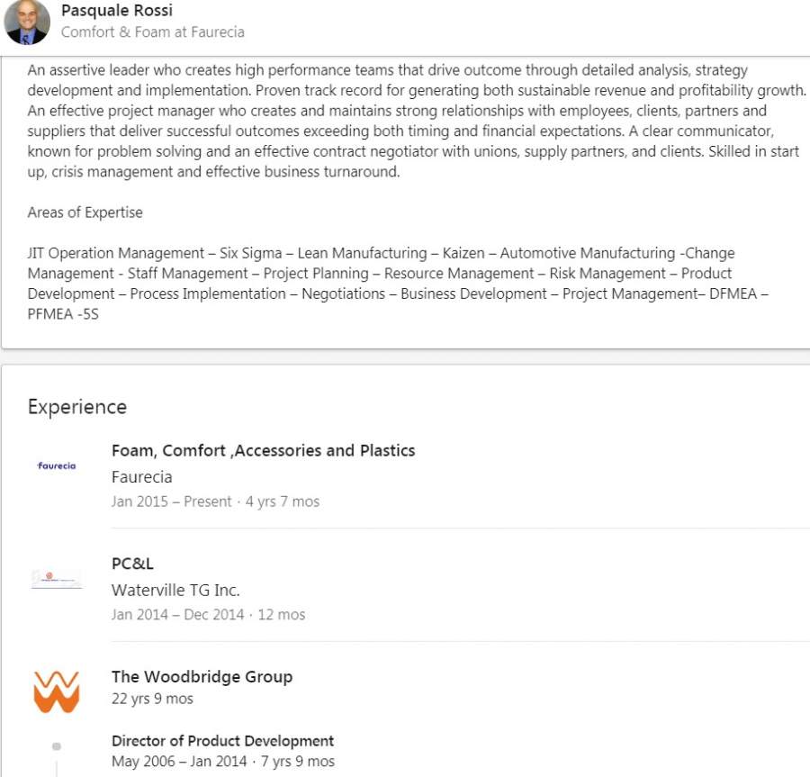 Polyurethane (PU) has dominated the automotive foam market for decades EPP (Expanded Polypropylene) is the up-and-comer and maybe cause of your layoff As an automotive foam specialist, you may or may not have anticipated the rise of EPP This minor oversight might keep you out of work for years outside of China, because - The automotive foam field appears really close-knit with veterans all having worked for the same companies The Woodbridge Group > Faurecia > Magna > Eaton - These companies might have Non-Competition Agreement's in place barring the pouching of each other's employees But you are IN CHINA! Your employer may have been outsourced labor (代工) or an OEM supplier to these big companies On a personal level, you have lots of manufacturing know-how and no NCA restriction Not only that, these international companies all have joint ventures in China already so you can enjoy all the benefits of working for a global company RIGHT NOW! Do NOT send the same resume to all these companies at once Customize your resume based on what you learn from early rejection Always send "Thank you" e-mail with sentences like "I shall contact you again by __[date]__ to follow up" Follow up with the Hiring Manager BEFORE HR rejects you with a generic form letter HR KNOWS NOTHING ABOUT ANY JOB DESCRIPTION !! -------------- Faurecia China (Shanghai) Jobs: https://cn.indeed.com/viewjob?jk ... =serp&vjs=3 https://cn.indeed.com/viewjob?jk ... =serp&vjs=3 https://cn.indeed.com/viewjob?jk ... tk=1deq1r154bs8p800 -------------- !! 请不要删帖 !! -------------- P Rossi @ Woodbridge.jpg P Rossi - 25-Yr Career Arc.jpg M Kolinko - 16-Yr Career Arc.jpg 2016 - PU @ WGSK's Wuhan Plant.jpg 2019 - EPP @ Woodbridge-Yanfeng JV's Changzhou Plant.jpg Brose (Shanghai) Jobs.jpg Faurecia China (Shanghai) Jobs.jpg |
