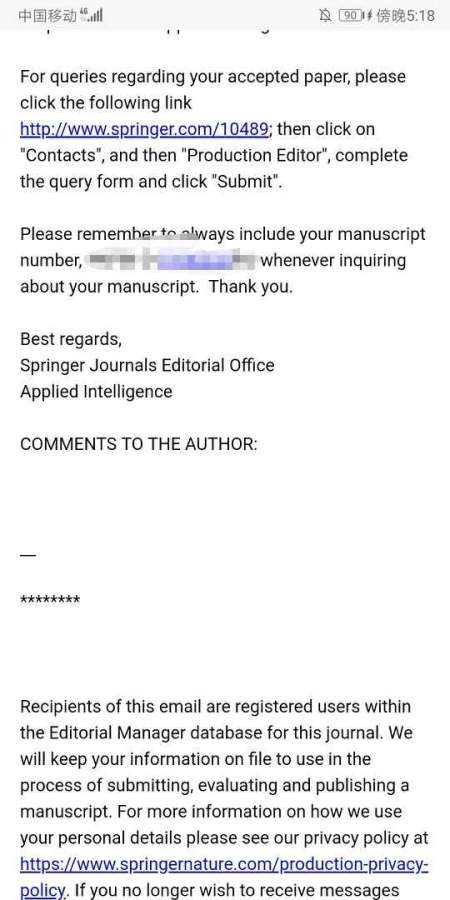 最近在Applied Intelligence 期刊上收到一篇论文的录用通知, 并通知去联系出版编辑。 但在网站上的“Contacts”中,似乎有两个出版编辑的联系人(可能是本人英语不太好的理解错误), 想咨询下应该去联系哪个? 录用邮件信息.png 网站信息.png |