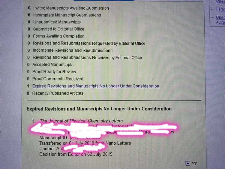 一周多以前投的nano letters,过了两天自己注册了个ACS ID,邮件通知在老板那里,自己不太清楚。过了几天再问老板已经说又投去JPCL了,前天晚上收到分配编辑邮件,昨天一早心血来潮去查状态,请问大佬们这个是说JPCL也拒了哈?可以看出是建议transfer的还是自己transfer的不? 发自小木虫IOS客户端 |