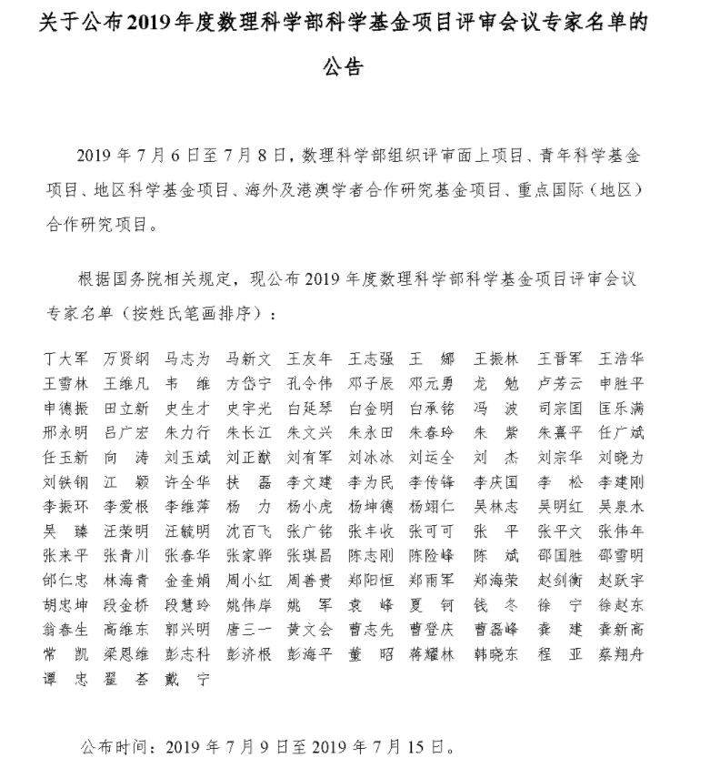 关于公布2019年度数理科学部科学基金项目评审会议专家名单的公告