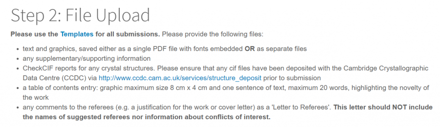 1. text and graphics, saved either as a single PDF file with fonts embedded OR as separate files 2. any supplementary/supporting information 3. CheckCIF reports for any crystal structures. Please ensure that any cif files have been deposited with the Cambridge Crystallographic Data Centre (CCDC) via https://www.ccdc.cam.ac.uk/services/structure_deposit prior to submission 4. a table of contents entry: graphic maximum size 8 cm x 4 cm and one sentence of text, maximum 20 words, highlighting the novelty of the work 5. any comments to the referees (e.g. a justification for the work or cover letter) as a 'Letter to Referees'. This letter should NOT include the names of suggested referees nor information about conflicts of interest. 第四项不太懂这个目录怎么做,里面是什么内容 1.png |