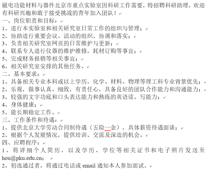 北京大学磁电功能材料与器件北京市重点实验室招聘科研助理