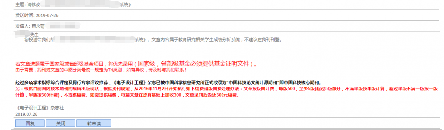 各位,今天杂志社回复邮件"文章内容属于教育研究相关学生成绩分析系统,不建议在我刊刊登。"是退稿的意思吗? 邮件中出现了"由于需要,我刊对文章的中图分类号统一规定为TN类别,如有异议,请及时与我们联系!"这句话,我自己看了一下自己的中图分类号写成TP类别了,是只要在论文中修改就行了吗? 希望知道的朋友可以回复一下,本人第一次投稿,急啊 ![]() FR`$U`_HP3L5}(NN0)7$0[G.png |