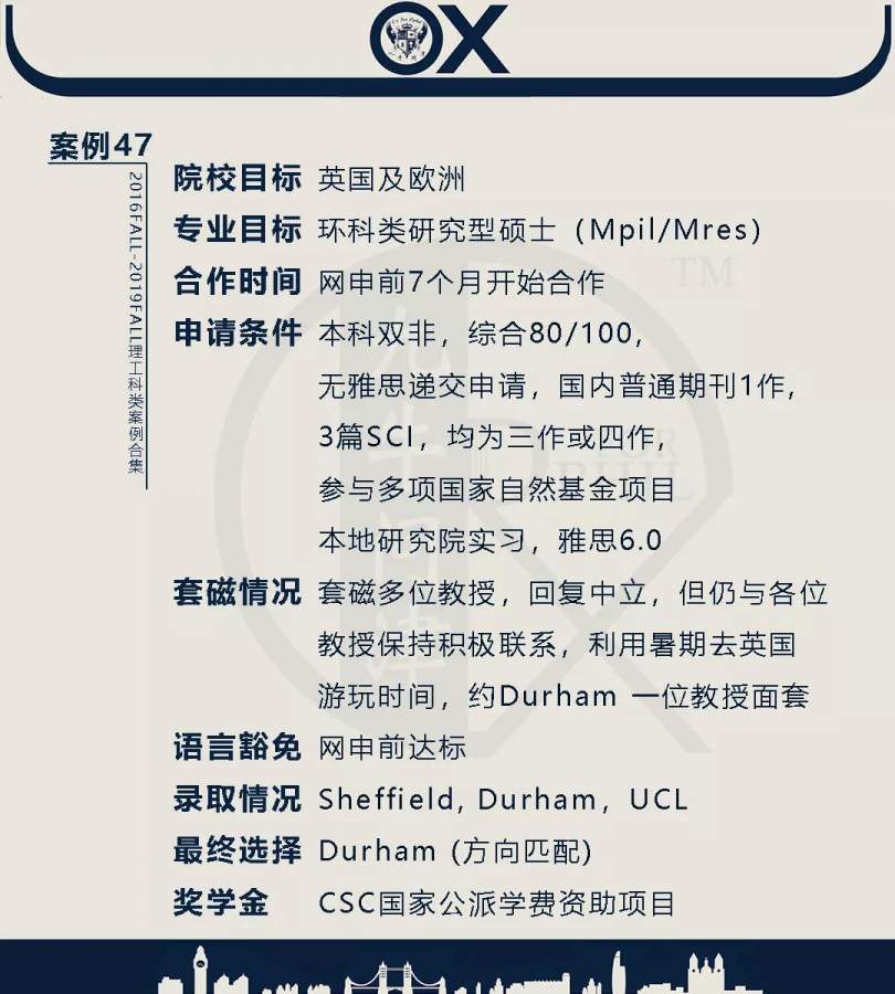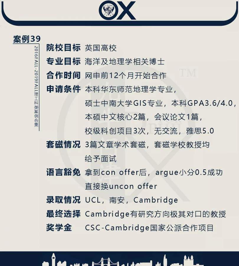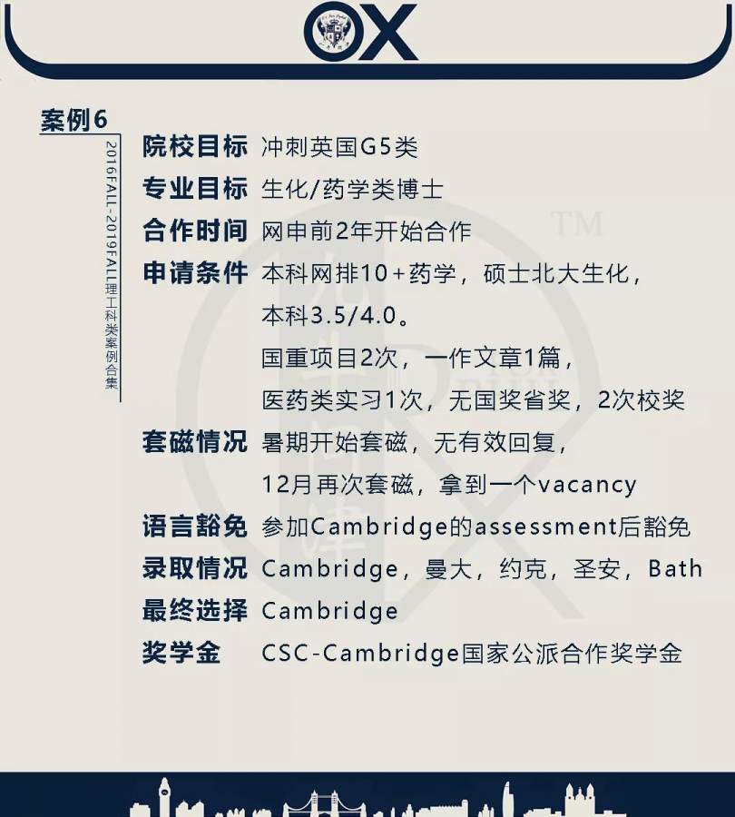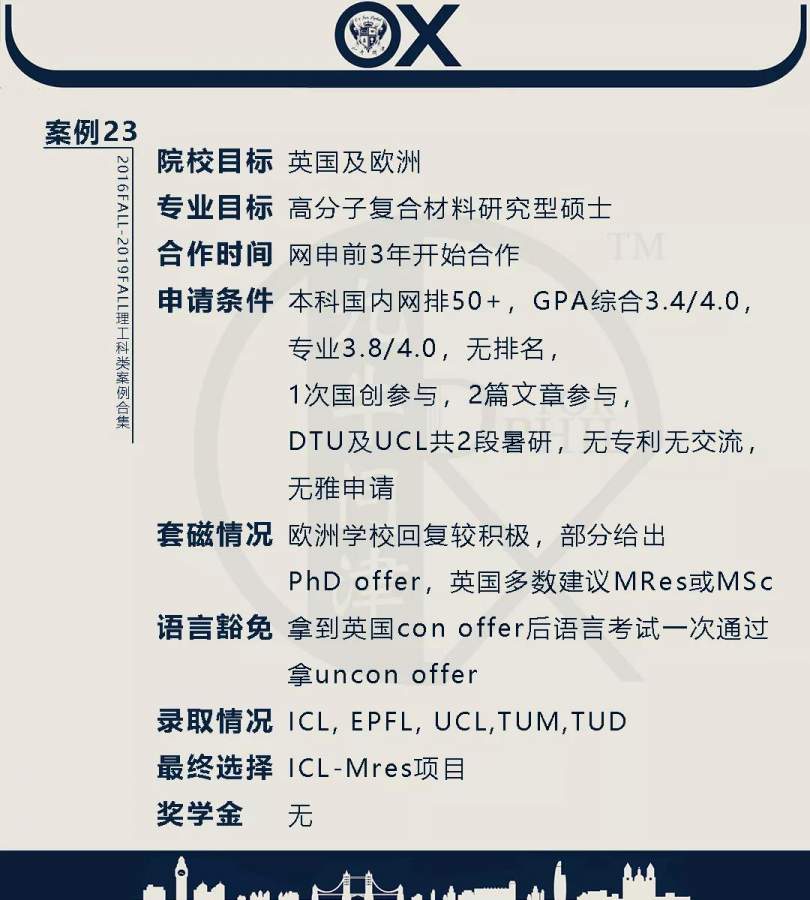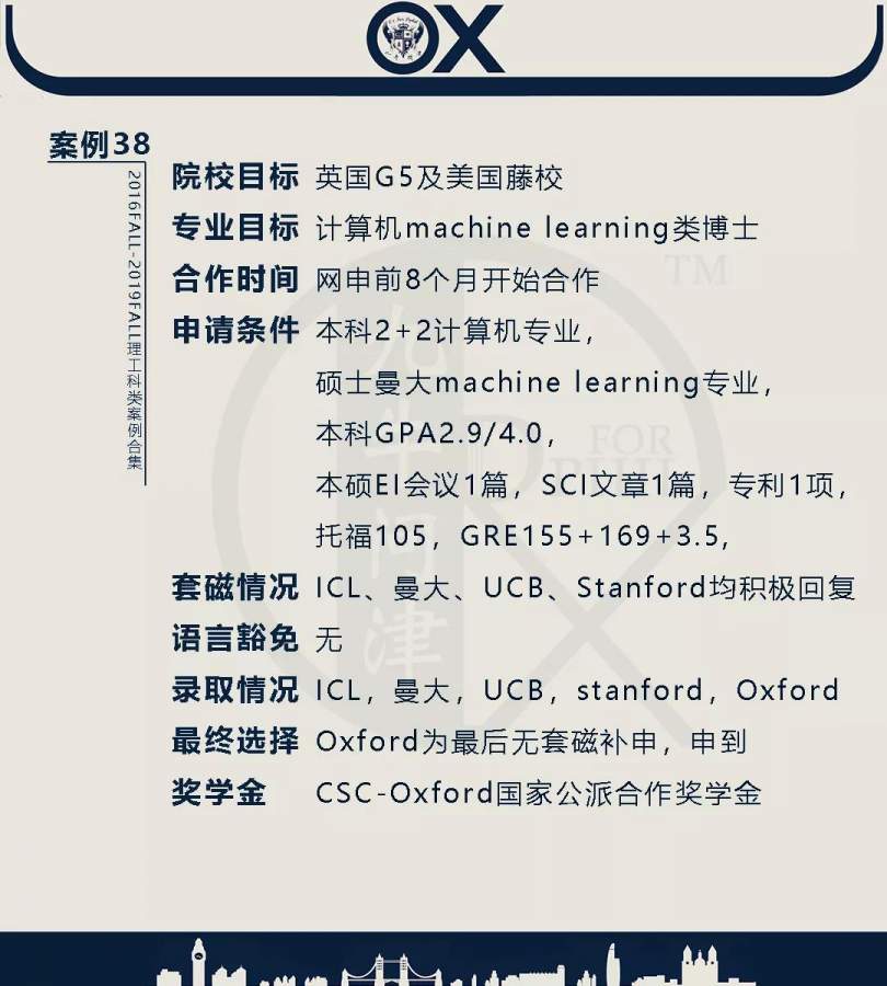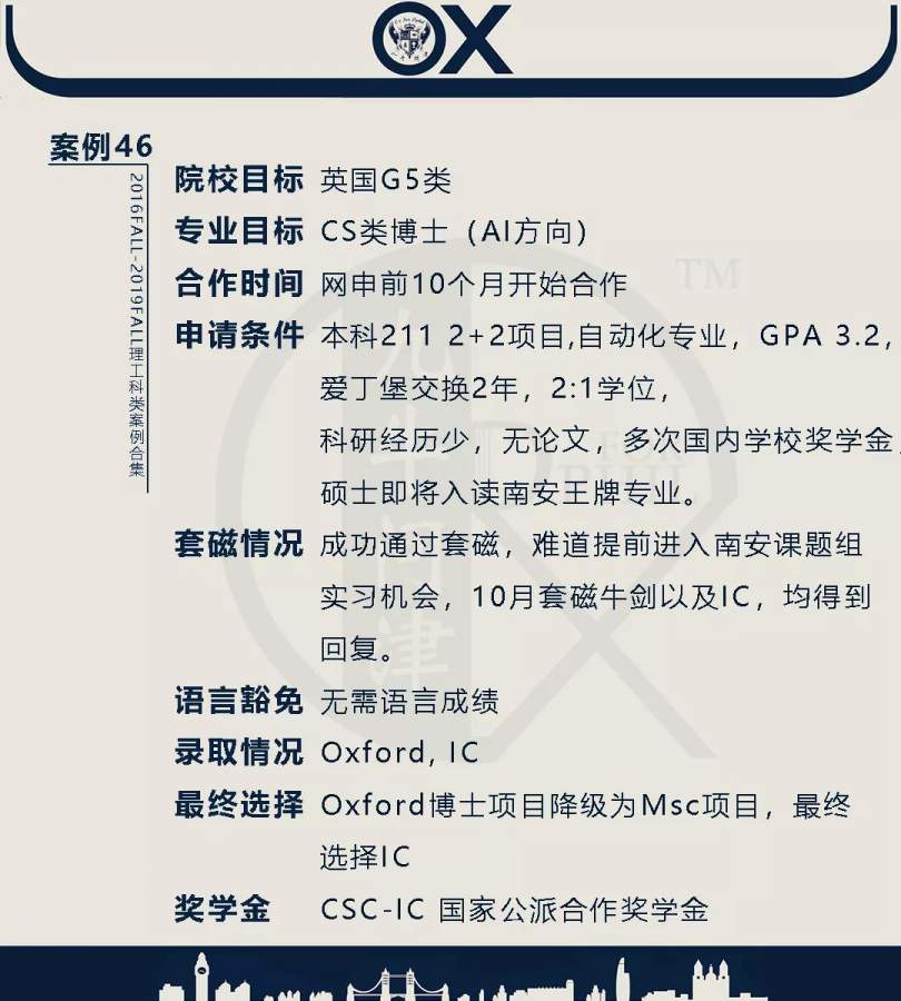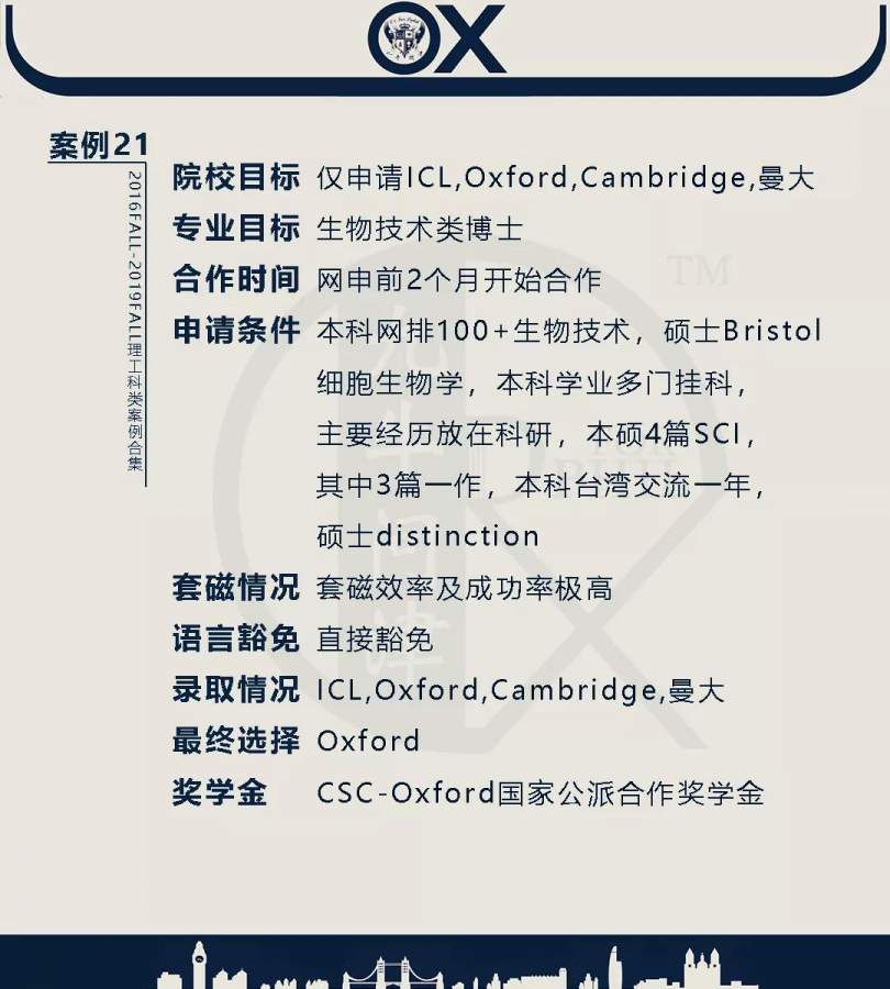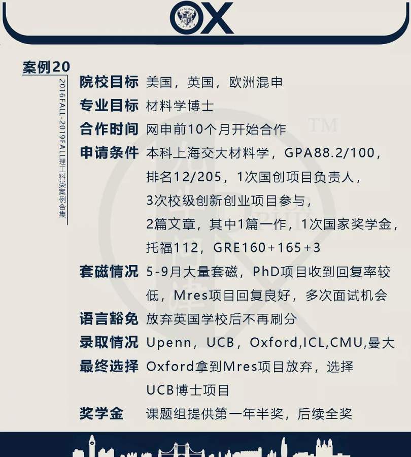 【郑重申明】 1、文中为截止2019FALL对应专业部分优秀录取案例,更多案例正在整理中,将持续更新; 2、文中所有案例为经过团队真实学员允许后采集、编辑、整理而来;应部分学员要求,重要信息部分已删除; 3、文中所有案例版权归九牛问津团队所有,未经允许,严禁任何形式转载或者盗用,违者必究。 申明: 1、本系列所有文章皆为100%原创 2、首发于知乎专栏《牛津公派博士小课堂》及公众号【九牛问津】 3、我已加入“维权骑士”的版权保护计划。未经允许,严禁任何形式转载或者盗用,违者必究。 4、希望各位准备留学的学弟学妹可以作为自身硬件定位的参考 |