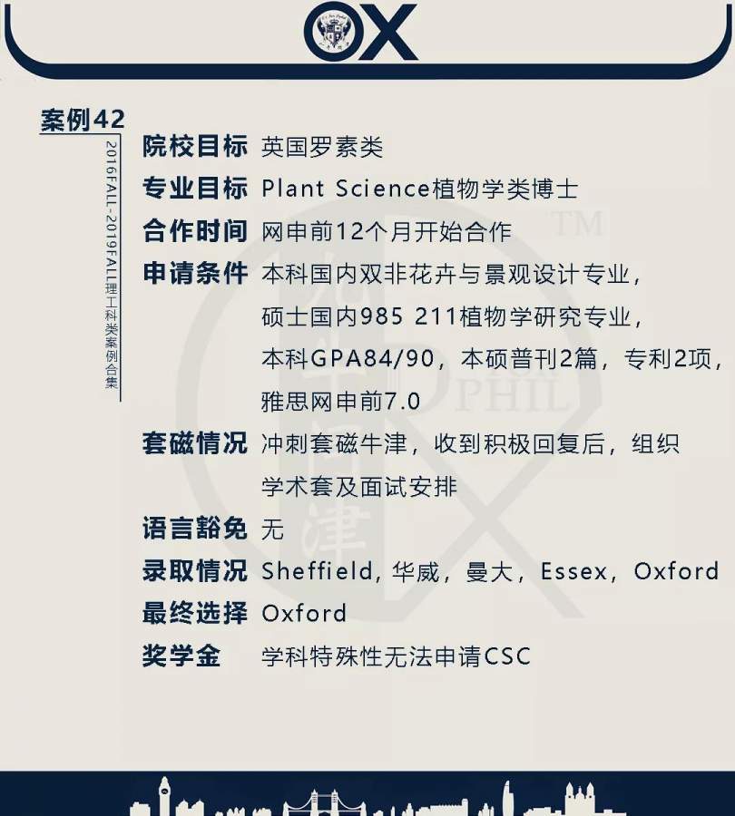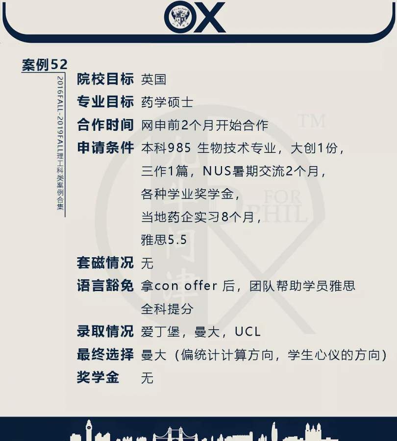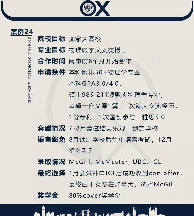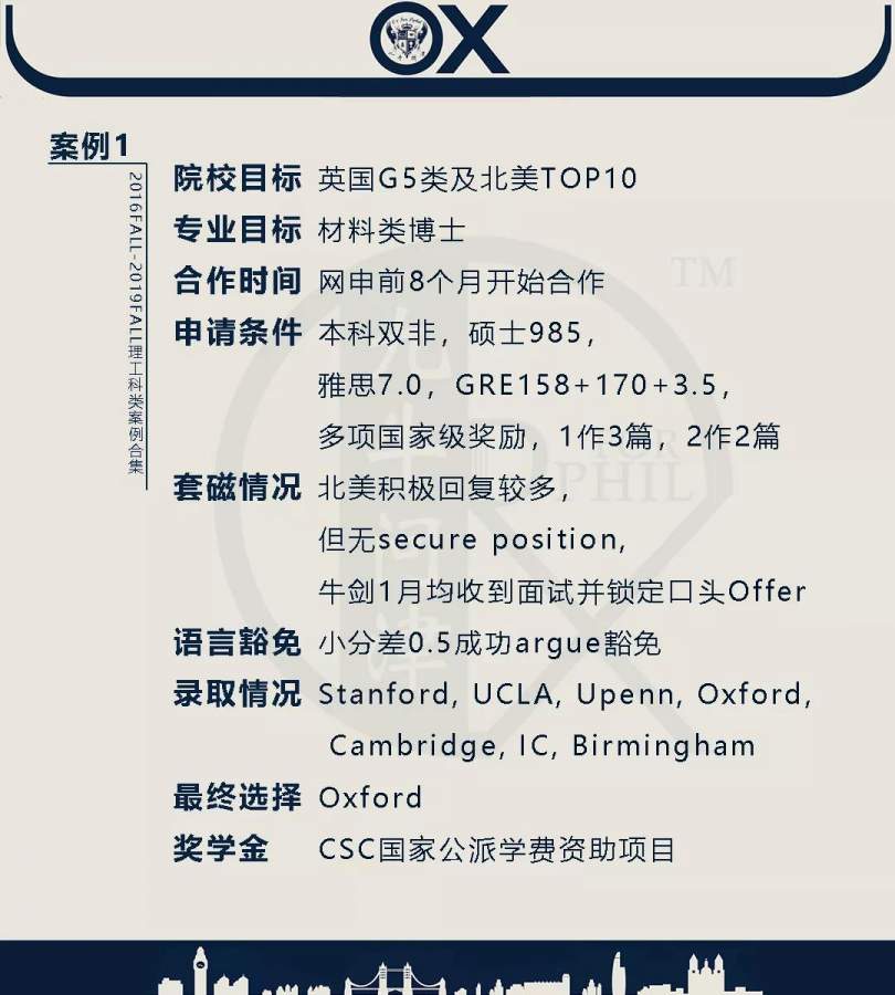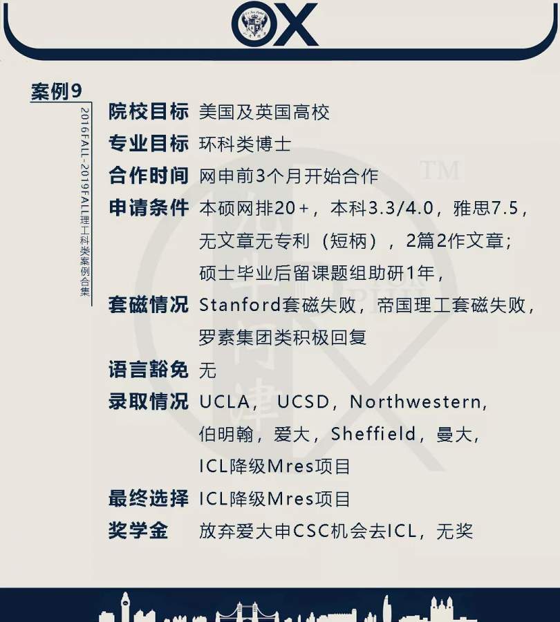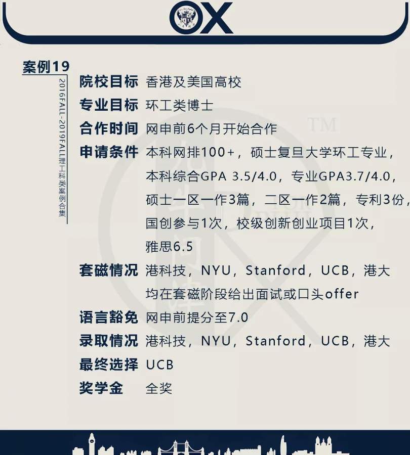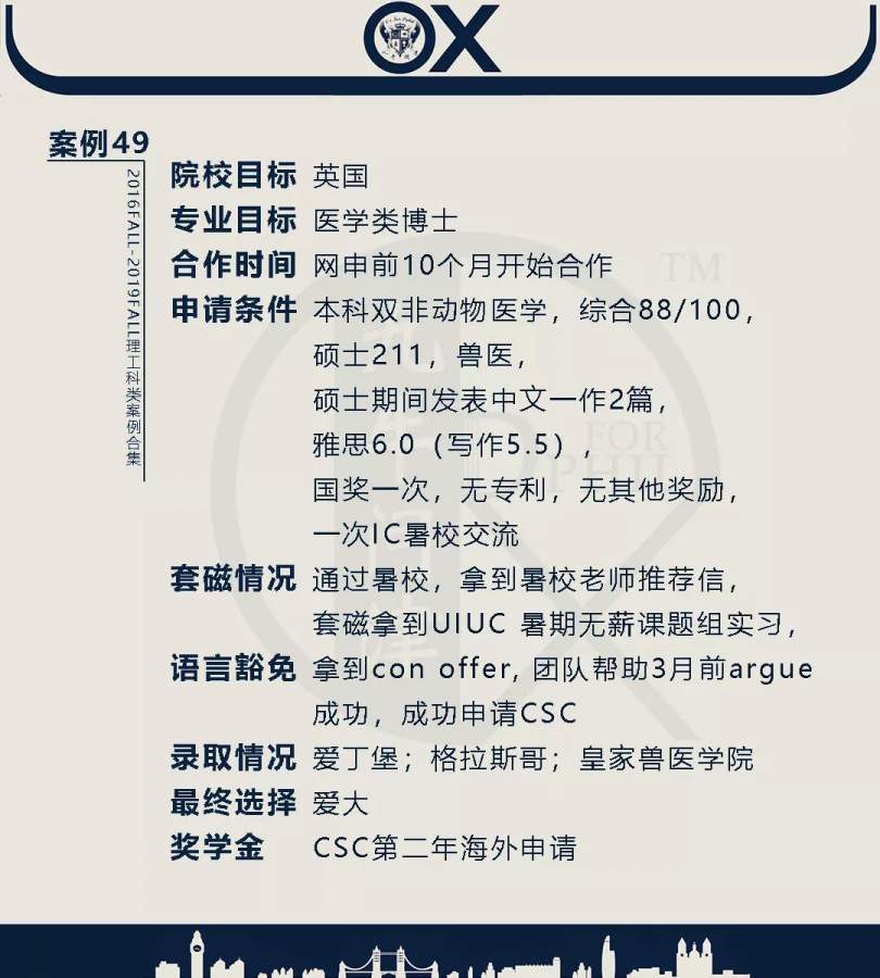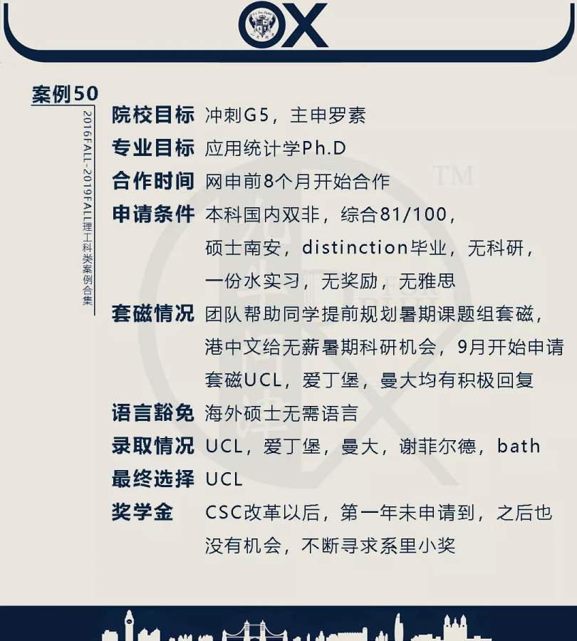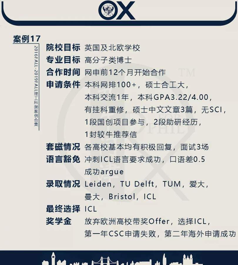 【郑重申明】 1、文中为截止2019FALL对应专业部分优秀录取案例,更多案例正在整理中,将持续更新; 2、文中所有案例为经过团队真实学员允许后采集、编辑、整理而来;应部分学员要求,重要信息部分已删除; 3、文中所有案例版权归九牛问津团队所有,未经允许,严禁任何形式转载或者盗用,违者必究。 申明: 1、本系列所有文章皆为100%原创 2、首发于知乎专栏《牛津公派博士小课堂》及公众号【九牛问津】 3、我已加入“维权骑士”的版权保护计划。未经允许,严禁任何形式转载或者盗用,违者必究。 4、希望各位准备留学的学弟学妹可以作为自身硬件定位的参考 |